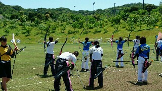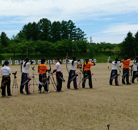 いつもの校内ではなく、県のアーチェリー場での練習にワクワクした様子でした。
