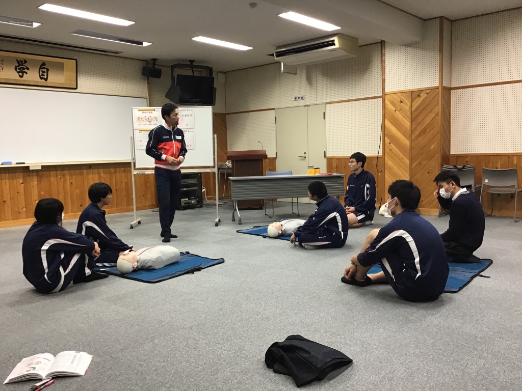 本校では「トレーニング論」という選択科目があります。スポーツや運動のことはもちろん、それらにつきものなケガを処置する方法などを学んでいきます。今回は日本赤十字社石川県支部から富樫氏をお招きして、救急救命法を学びました。