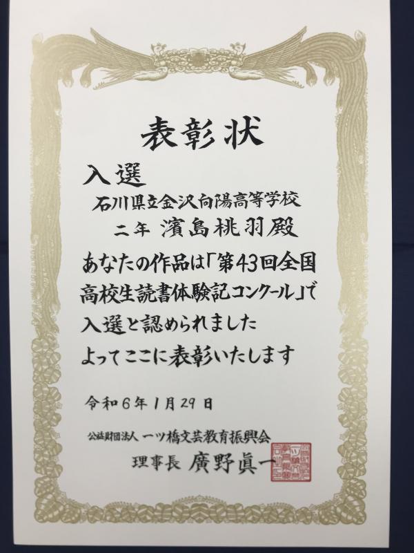このたび、第43回2023年度「全国高校生読書体験記コンクール」において、濱島桃羽さん(2年)が入選を果たしました。雨宮処凛執筆の「不登校にはどんな支援が必要か~学校、行かなきゃいけないの?~」について自身の感想や自分が気づいて、どのようにしたかを振り返り”読書体験記”を書きあげました。