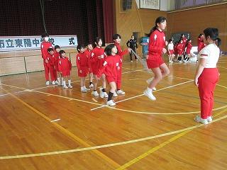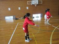 次に持久跳び。1・2年生は1分間、3・4年生は2分間、5・6年生は3分間跳び続けます。どの跳び方が長く続けられるでしょうか。
