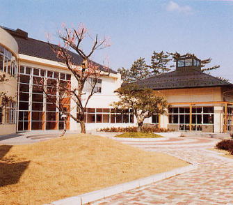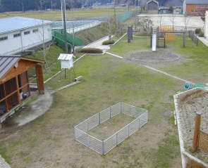 校舎の後ろに、遊具や花壇、飼育小屋があります。