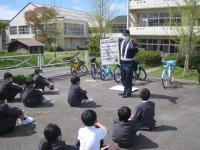 4月27日(火)交通安全教室がありました。交通安全ボランティアの代表の方との対面式のあと、警察署の方より交通安全のお話を聞きました。お話の後、実際に道路を歩いたり、道路で自転車に乗ったりしながら交通安全について学びました。