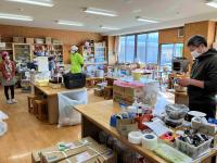 川崎市職員の方々が、2階社会科教室で罹災証明交付窓口を、1階の物資置き場で仕分け等を行っていました。