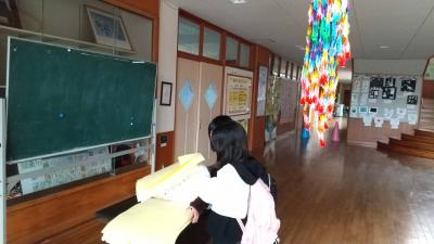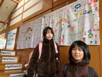 下校時、階段の壁に掲示してある愛媛県の小学校からの応援旗を立ち止まって読んでいました。
