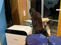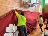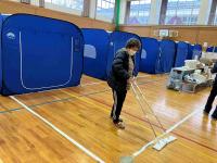 朝、町野小体育館避難所で地域の方が、掃除機やクイックルワイパーなどをもって
