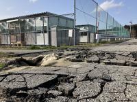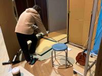 町野小避難所のシャワーの後片付けと掃除をする職員。