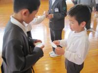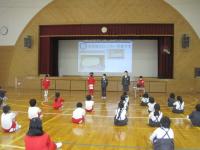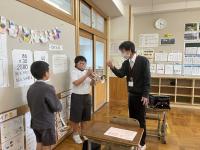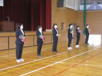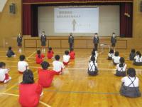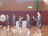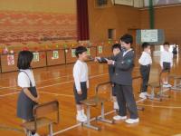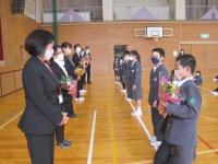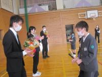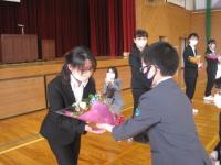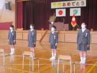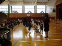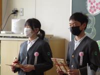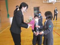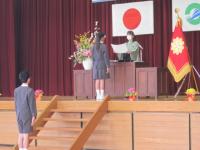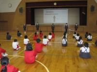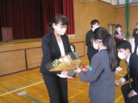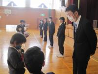 離任式では卒業生も参加し、お別れの挨拶を聴き、児童代表がお礼の言葉とともに花束をわたしました。