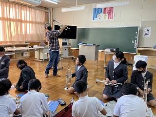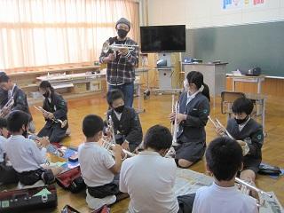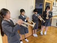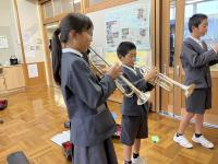 初めてトランペットを扱う3年生に対し、6年生も個別に教えていました。