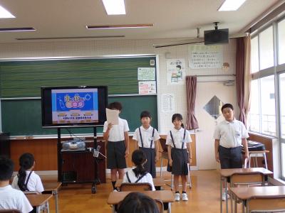 保健環境委員会が、全校のみんなに熱中症予防をよびかける発表をしてくれました。