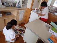教室では、子どもたちが夏休みの課題について確認したり、本の借りかえをしたりしていました。