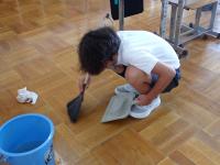 その後、教職員と中学生でワックスがけを行いました。