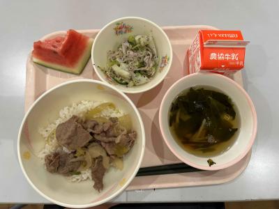 今日の給食は、夏野菜カレーの予定でしたが、JAのとさんから能登牛をいただき、急きょ牛丼にメニュー変更となりました。