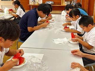 震災後からずっと応援してくださっている『町野大好きさん』のみなさんが、登校日にあわせて大きなスイカを届けてくださったので、10時のおやつにみんなでいただきました。甘くて本当においしいスイカでした。