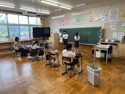 本日の3時間目、中学校の生徒会が小中合同体育祭のオリエンテーションを体育館で行ってくれました。
