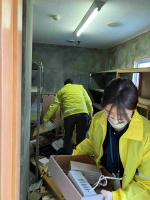 町野小避難所のシャワーの後片付けと掃除をする職員。