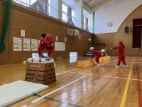 腕支持の感覚や横跳びこし、ステージ転がり下り、またぎ乗り・またぎ降り等をたっぷりしてから、