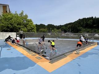 能登町教育委員会・柳田小学校のご協力をいただいて、今年度も柳田小学校のプールをお借りして水泳授業をさせていただけることになりました。そこで29日(木)の午後、柳田小のプール掃除に56年生が参加させていただきました。