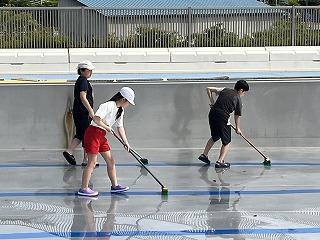 大プール・小プールに分かれて、両校入り混じって掃除が始まりました。