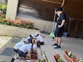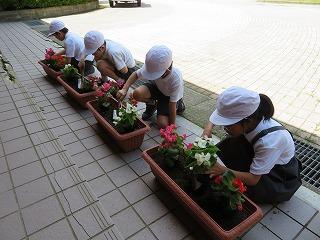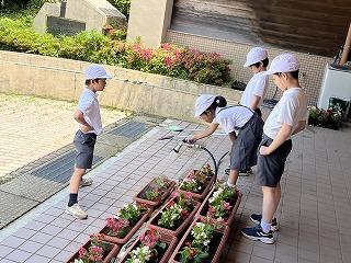 町野公民館さんから、花のまちづくり事業として援助をいただいたので、校務士さんが選んでくれたベゴニアを3年生が植えてくれました。