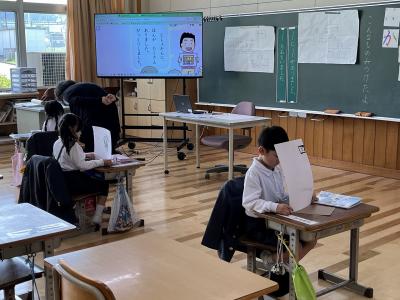 1・2年生は国語の学習。先生が1年生と2年生を渡って授業をする複式授業です。