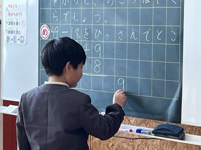 前に出て、ひっ算での計算の仕方を考えて説明しています。