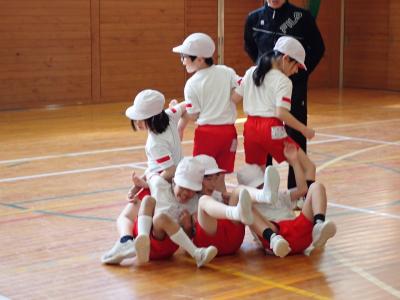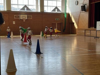 体を移動したり用具を使ったりする運動です。友だちと協力し、工夫しながら体を動かしています。