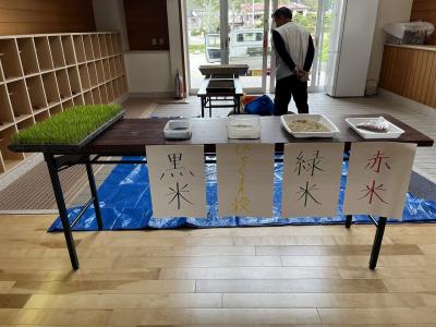 赤・緑・黒の古代米とひゃくまん穀を準備して、見た目や香り、手触りなども観察させてくださいました。