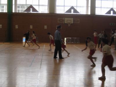 児童たちは安全な場所に静かに避難する練習です。警察の方に「とても静かだったので、どこにいるかわからなかったよ」と褒めていただきました。
