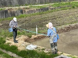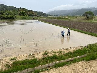 いよいよアート田の田植えが近づいてきました。指導してくださる本手さんご夫妻が子どもたちのデザインにあわせて田んぼの中に目印のテープ張りをしてくださいました。