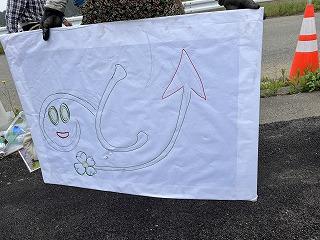 広い田んぼいっぱいに図案ができあがりました。田植えは5月28日か30日、お天気を見て決めます。田植えを一緒に体験して応援してくださる方を募集しています。子どもたちは自作のチラシを作って、公民館やもとやスーパーさん、仮設住宅などに配りました。一緒に田植えをして、浮かび上がった美しいアート田をながめてくださる方、秋の実りを一緒に楽しんでくださる方がたくさん集まってほしいと願っています。