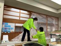 避難所運営をサポートしてくださっている赤いビブスのYMCAの方々。