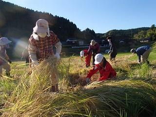 10月19日(水) 5・6年生が、学校田で古代米稲刈り体験をしました。