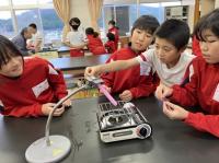 示温インクを入れたビーカーや試験管を、カセットコンロの火で温め、観察しました。