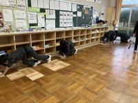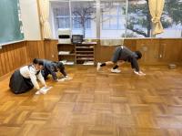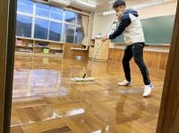 各教室のワックスがけのため、3~6年生で、縦割り班に分かれてきれいに水拭き掃除をしました。
