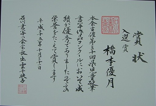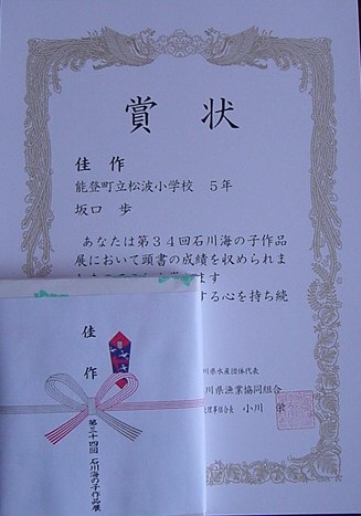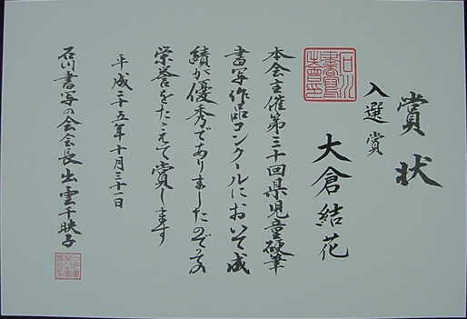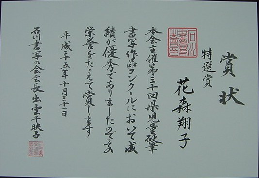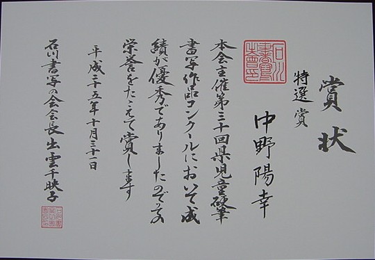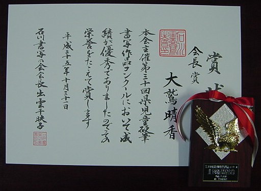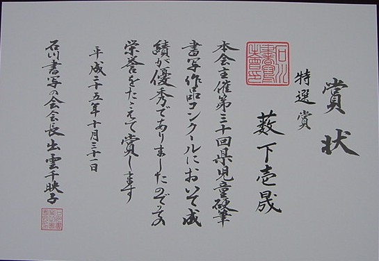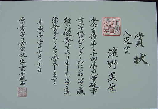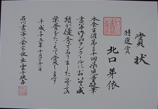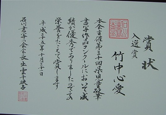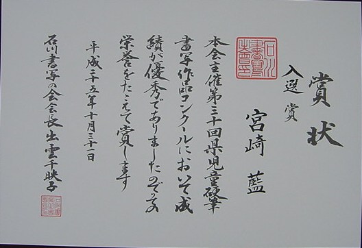 【第30回石川県児童硬筆書写作品コンクール】