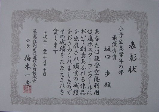 【能登空港利用促進ポスターコンクール 小学生高学年の部 最優秀賞】平成25年10月30日(水)