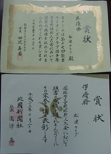 【第17回能登ライオンズクラブ旗争奪学童野球新人大会 準優勝】松波クラブ