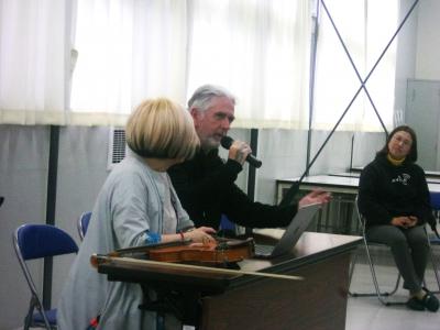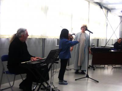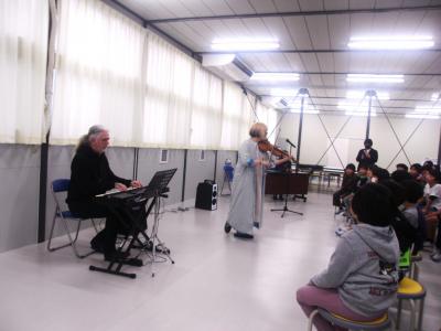 12月15日(月)です。今日の5限目に、ヴァイオリンコンサートが行われました。演奏してくださったのは、ヴァイオリニストの鹿嶋静さん。ピアノ伴奏はStephen Smallさんです。