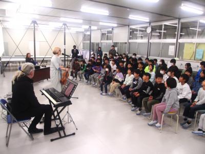 当日は、オーケストラ・アンサンブル金沢より弦楽四重奏(バイオリ ン2名、ビオラ1名、チェロ1名)の皆様と、ソプラノ歌手の直江様が来校してくださいました。「鬼滅の刃」 紅蓮華 から始まり、オペラ、タンゴ、クラシック、子どもたちがよく知っている曲、そして本校校歌まで、多彩なプログラムを披露してくださいました。