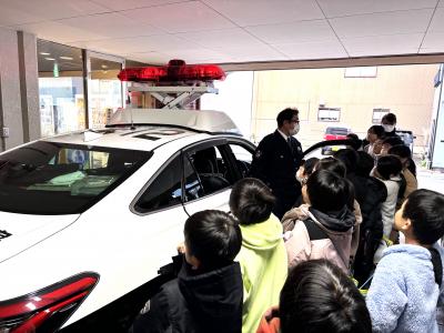 12月9日(月)に3年生が社会科の学習の一環で警察署の見学に行ってきました。見学させていただいたのは珠洲警察署能登庁舎です。警察署の仕事についてお話を聞いたあと、実際に着用している耐刃防護衣を着させていただいたり、警棒や警察手帳、手錠まで見せていただいたりしました、また、実際のパトロールカーも見せていただき、中に乗り込んで、マイクも使わせていただきました。とてもわかりやすく説明していただき、警察のお仕事について大変よくわかりました。珠洲警察署能登庁舎の皆様、大変お忙しい中、本当にありがとうございました。