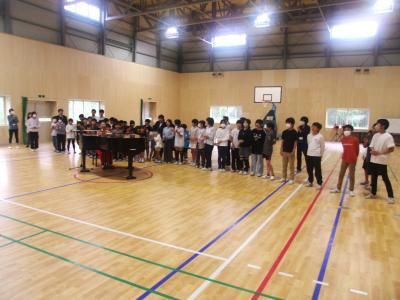 今日の2限目に素敵なゲストが来校されました!NHK for schoolでおなじみの歌手・タレントの谷本 賢一郎さん、歌手の瑛人さん、そして今回の企画から運営まで行っていただいたCANDLE JUNE(キャンドル・ジュン)さんとLOVE FOR NIPPONの皆様です。仮説体育館を会場としてCANDLE JUNEさんのトーク、歌手の谷本 賢一郎さん、瑛人さんの歌を聴くことができました。谷本 賢一郎さんは、「LOVEをプレゼント」や「バスにのって」など3曲、瑛人さんは代表曲の「香水」など2曲を披露してくださいました。途中、リズムをとったりや体を動かしたりして、あっという間の1時間でした!最後にCANDLE JUNEさんから、熱い思いと私たちへのメッセージをいただきました!本当に楽しい1時間になりました。CANDLE JUNEさんをはじめ、本日来校していただいた皆様、本当にありがとうございました!またのご来校をお待ちしております!