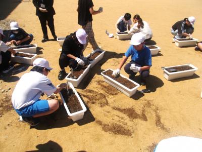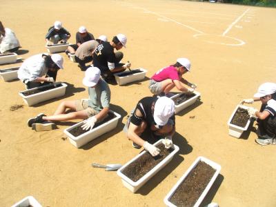 5限目に5・6年生が、プランターに花の種を植えてくれました。今日植えた種は、千葉県流山市立南流山第2小学校の皆さんから送っていただいた種です。ジニア・マリーゴールド・ひまわりの3種類を植えました。本校は、仮設校舎のため花壇が無く、プランターを総動員して植えました。子どもたちがとても丁寧に植えてくれてたのが嬉しかったです。きれいな花が咲くといいですね!南流山第2小学校の皆さん、ありがとうございました!