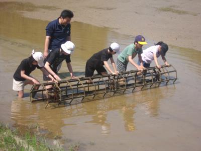 その後、水田に入り田植えを行いました。慣れない水田で足をとられ、尻もちをつく児童もいましたが、最後まで頑張って植えることができました。児童たちは、学校ではできない、とても貴重な体験をすることができました。