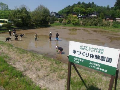 5月9日(火)、今日は朝からとても良い天気になりました。5限目に5年生がJA内浦町さんのご協力で,田植え体験を行いました。