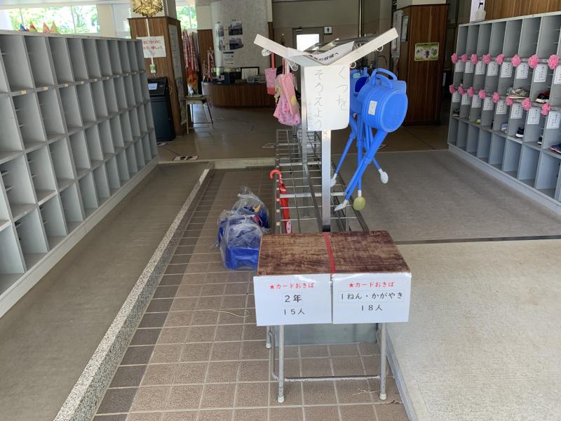 ・登校の際,玄関前で≪検温チェックカード≫を確認します。登校時間は7時30分より早くならないようにしてください。