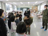 本日、自衛隊の皆さんから支援物資として歯ブラシ・歯磨き粉、タオルをいただきました。児童に配付しましたので、ご家庭で活用していただければと思います。