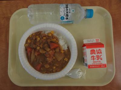 北陸チャリティーレストランさんからミートソース丼を提供していただきました。そして、昼食が始まって以来はじめて牛乳がでました。