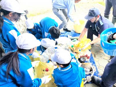 海上保安官の方から諸注意や説明をしていただき、20分間で総重量40kgのゴミを拾うことができました。その後、ゴミを種類毎に分類し、その重さを量ることで、事前学習と比較しながら、どの種類のゴミが多いのか実際に調べることができました。最後には、子どもたちの質問コーナーもあり、海上保安官の方々が丁寧に答えてくださいました。それにより新たな気づきや今後の学習につながる疑問が見つかったようです。