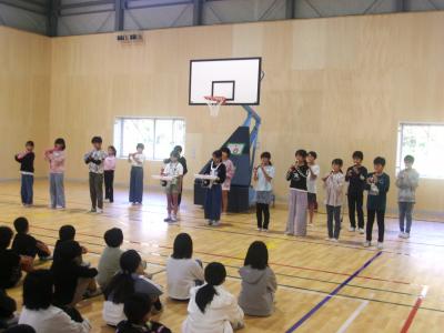 11月15日(金)の朝タイムに児童集会がありました。きょうは、大きな声であいさつした後、今月の歌、学年発表と続きました。今日の学年発表は4年生です。4年生は、総合的な学習の時間に学習した松波の祭りや特産品と海洋教育で学習したことをクイズ形式でまとめて発表してくれました。最後には、練習してきたリコーダーの発表もあり、とても素晴らしかったです。