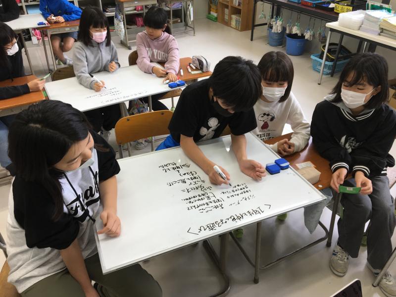 5年生は国語「よりよい学校生活のために」と関連して、「みんなが安全に使うろう下プロジェクト」について、ホワイトボードを使って話し合いました。